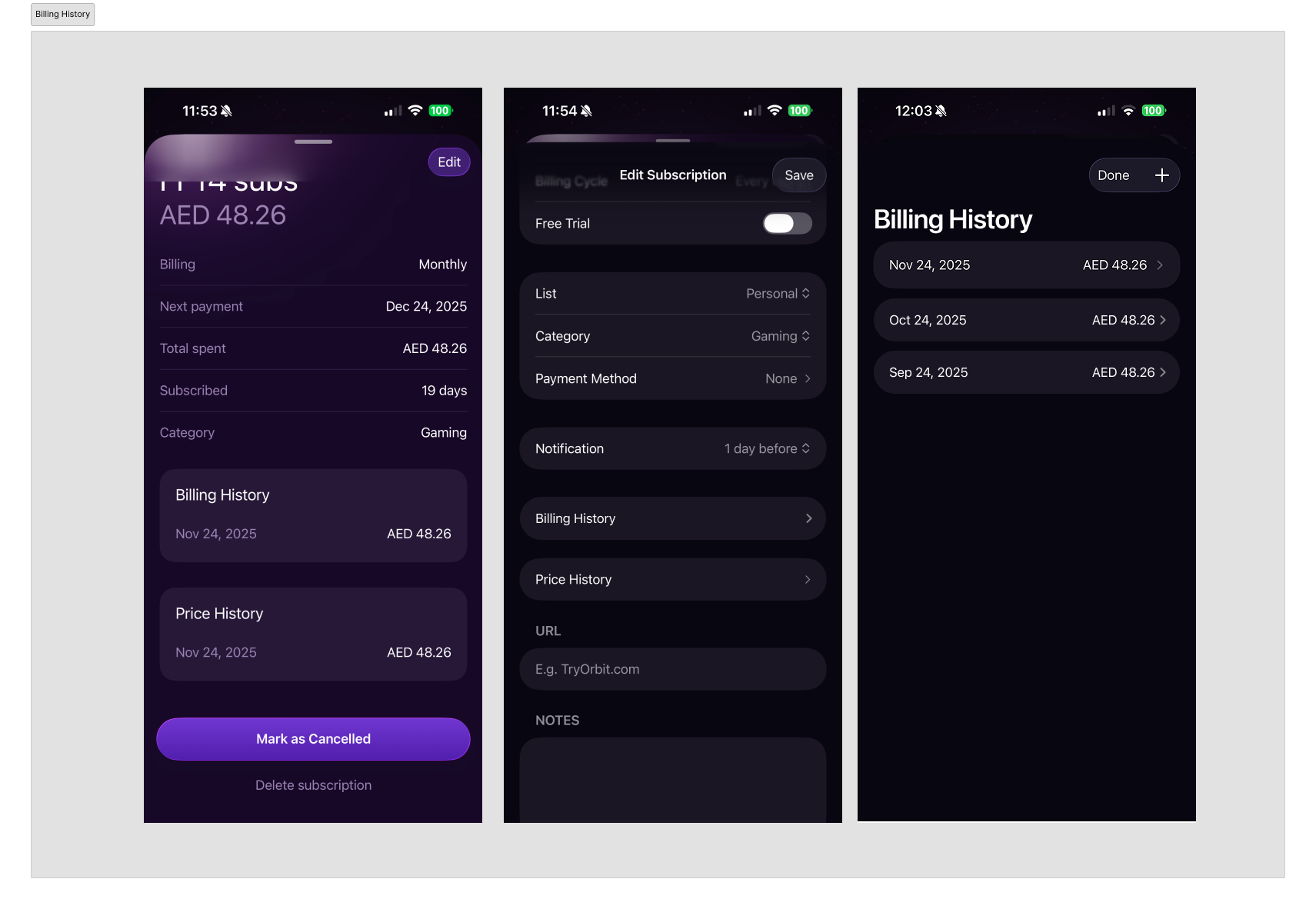 I added a design to improve the billing history, because I would like to see in a way how much I spent on this app or tool overall in the app details,Just a suggestion I would love to seeThanks for the awesome appSA